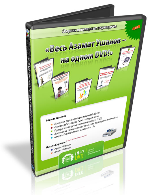 На Одном ДВД собраны ВСЕ(!!!) видеокурсы признанного лидера электронной коммерции в Российском Интернете – АЗАМАТА УШАНОВА, зарабатывающего в Интернете весьма нехилые деньги!